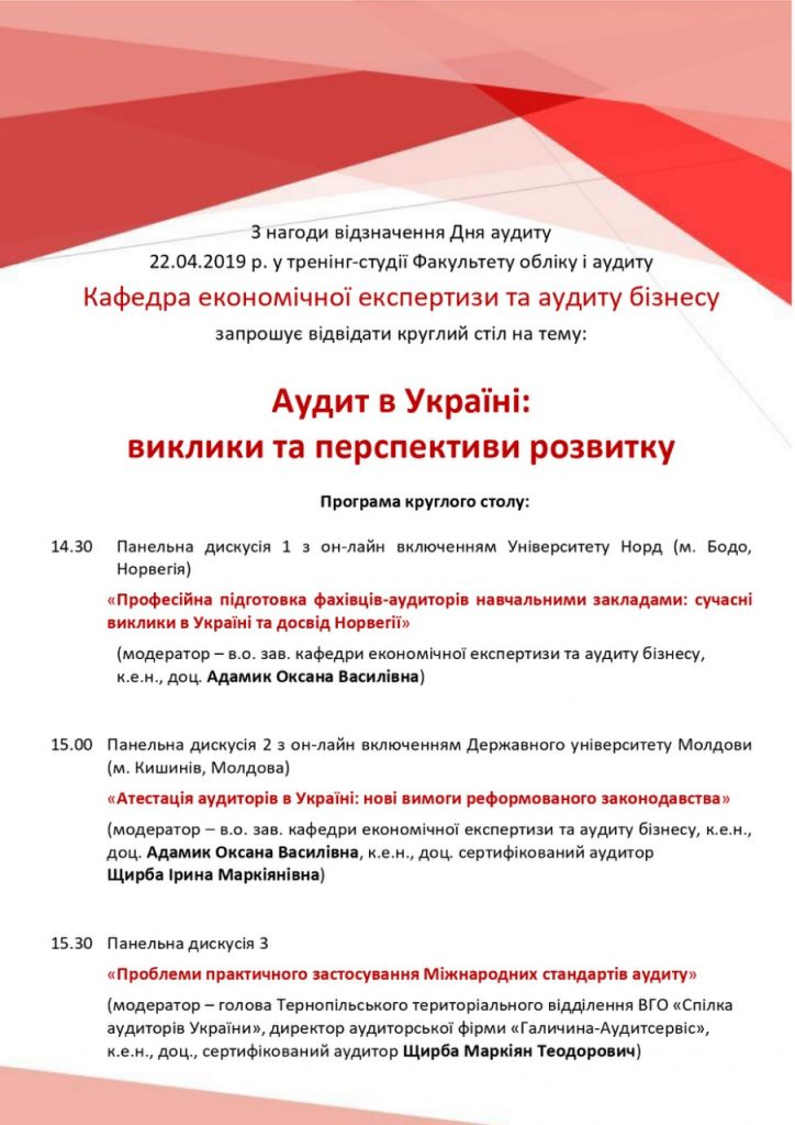 23 квітня 2019 року відбувся науково-практичний круглий стіл на тему: «Фінансова та нефінансова звітність підприємства: проблеми її формування та аудиту» організований кафедрою економічної експертизи та аудиту бізнесу факультету обліку і аудиту ТНЕУ. У заході взяли участь представники професорсько-викладацького складу кафедри Читати далі …