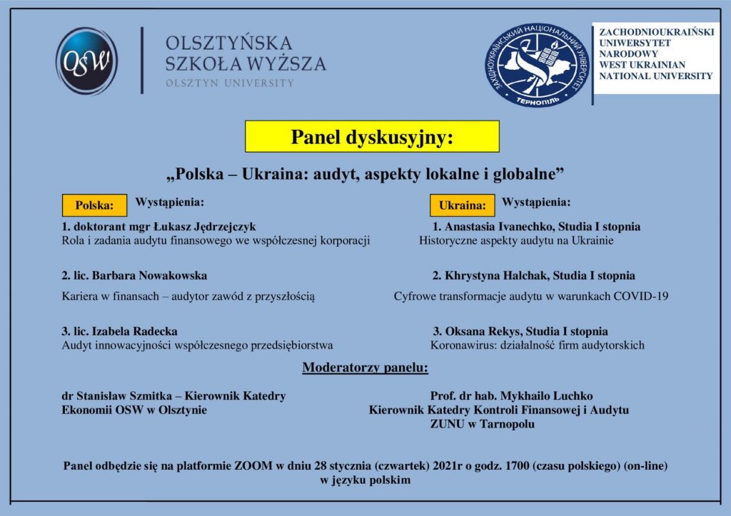 28 січня 2021 року відбулася ДИСКУСІЙНА ПАНЕЛЬ: «ПОЛЬЩА – УКРАЇНА: аудит, аспекти локальні і глобальні» / «Polska – Ukraina: audyt, aspekty lokalne i globalne» організована кафедрою фінансового контролю та аудиту факультету фінансів та обліку ЗУНУ та кафедрою економіки Ольштинської Вищої Читати далі …